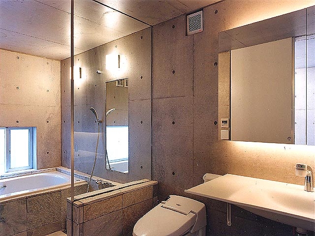 東京都港区の邸宅や高級マンションが点在する都心の閑静な住宅地に位置する住宅である。仕事のおつき合いの方を招くパーティーが多いため、出来るだけシンプルで生活感のない空間を要望された。都心の22坪の小さい敷地に積層する地下1階から3階までの空間をクレパス状の階段室を設け、タテ空間を繋いだ。 メインアプローチを道路面より2m上げたレベルに設定して、B1Fに光を抑えた個空間、2Fに明るいリビングダイニングを設けた。南側には隣家が接近しているため、接道方向である東北からの開口を大きくとり、北東側の眺望も取り入れ、スカイバーと連続するダイニングの吹抜は、拡散光で一日を通して安定した明るい空間である。