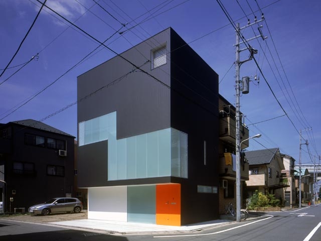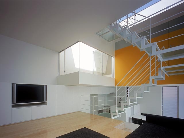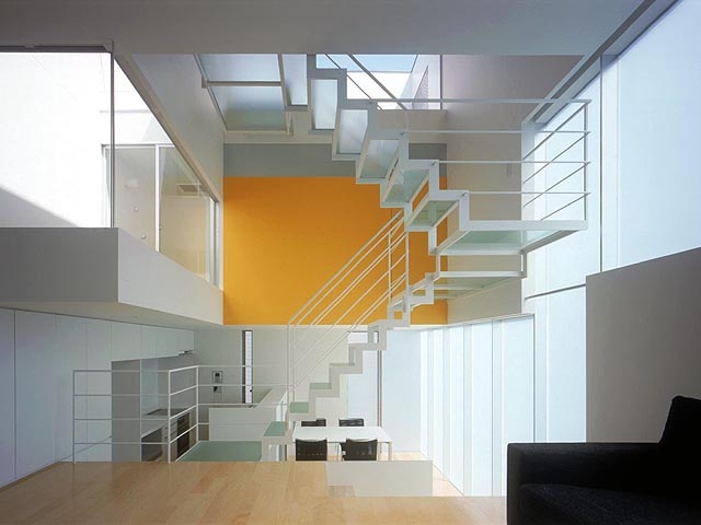 この住宅は、東京都内の住宅地に建つ30代夫婦と子供2人の4人家族のための住宅である。建物全体のタテ空間を合理的に構成するための8つの床レベルとそれぞれ異なった天井高が設定された。床レベルのズレに対応するようなカーテンウォールの大きな開口部は、鉄骨のブレース構造によって可能となり、この建物の外観を特徴づけている。このカーテンウォールは、乳白色ガラスを採用することにより、周囲からの視線を切り、拡散光で常に明るい内部空間を創り出している。建物ヴォリュームへ立体的に挿入された外部空間(テラス)は、内部化された外部として、様々なスケールによる空間の繋がりが意外な視線の抜けを生みだすことになった。